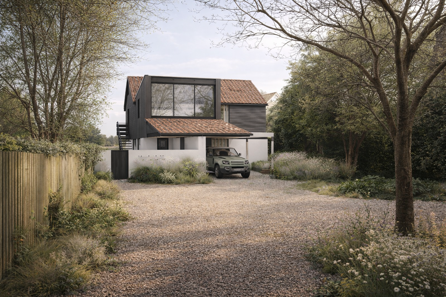 This project involves a first floor extension to a detached house in Essex and is currently under construction. The home is arranged as an upside down layout, with living spaces at first-floor level to take advantage of far-reaching views. The extension creates a mid-century inspired open plan kitchen, dining and living area, designed to capture natural daylight and frame the surrounding landscape. An external stair strengthens the connection between the elevated living spaces and the garden below, encouraging everyday use of the outdoors.
